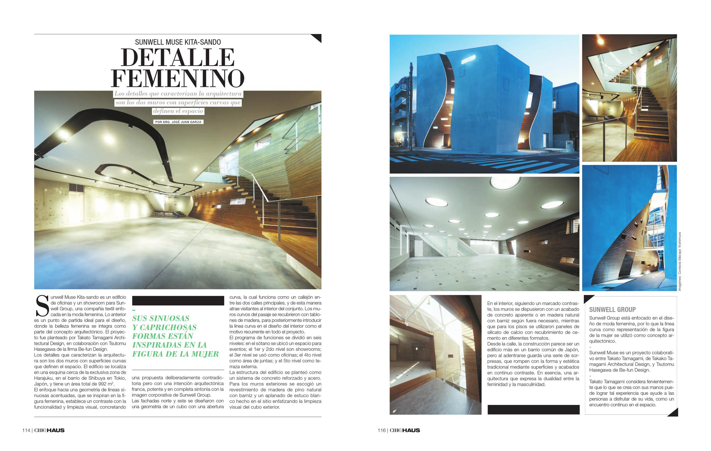 Sunwell Muse Kita-sando es un edificio de oficinas y un showroom para Sunwell Group, una compañía textil enfocada en la moda femenina. Lo anterior es un punto de partida ideal para el diseño, donde la belleza femenina se integra como parte del concepto arquitectónico. El proyecto fue planteado por Takato Tamagami Architectural Design, en colaboración con Tsutomu Hasegawa de la firma Be-fun Design.
